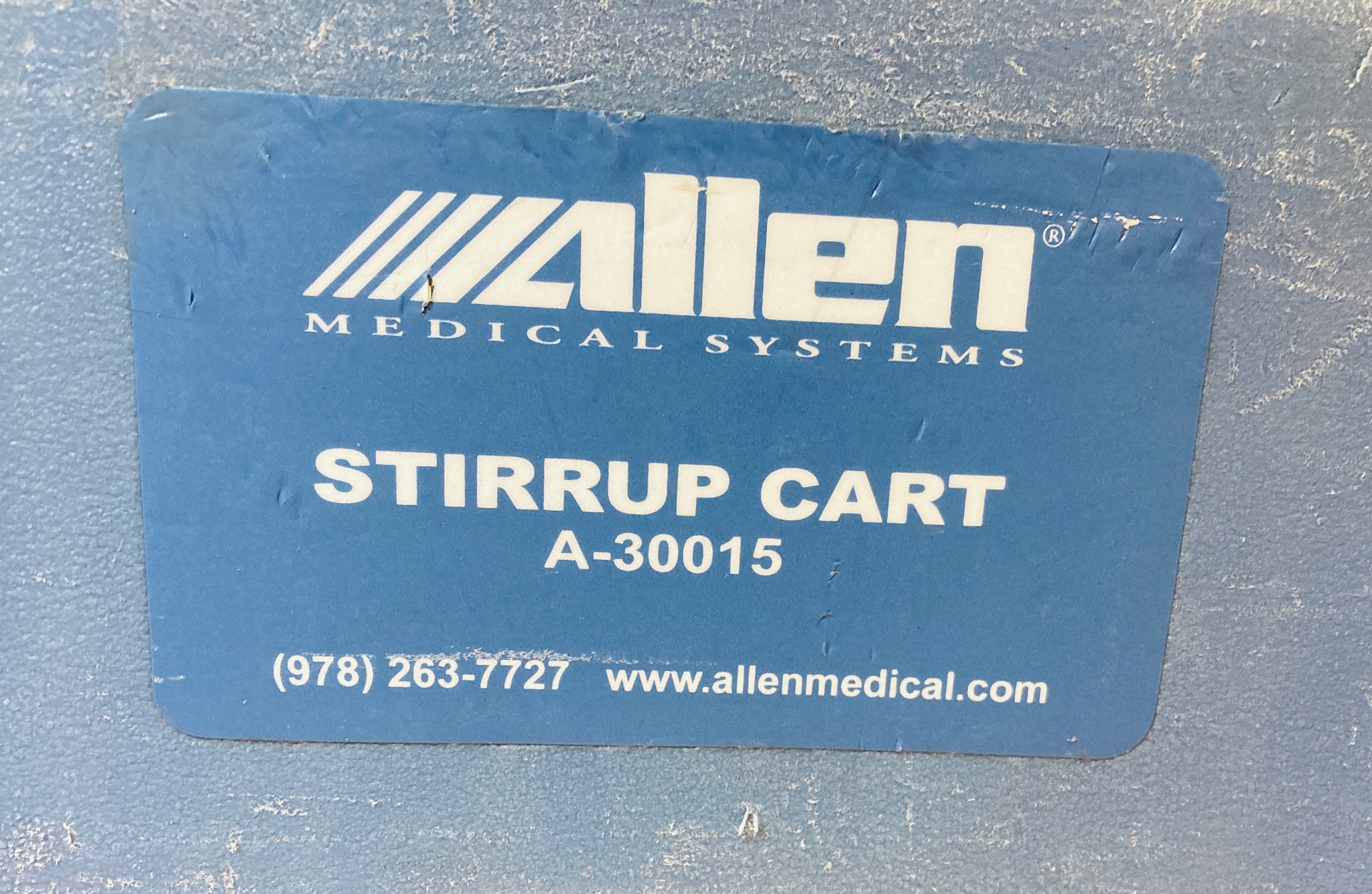 Allen® Stirrup Cart A great way to store and protect your investment! This strong and lightweight cart holds and transports your stirrups or leg holders. Compact and state-of-the-art, this Cart will hold any stirrup from any manufacturer. The sturdy, molded, four-caster polymer base is dent resistant. The deep storage bin stores clamps and pads securely. Two different size hooks allow this storage cart to hold a variety of stirrups. Hold up to 3/4” (2 cm) rod on the smaller hook and up to a 1” (2.5 cm) on the larger hook.