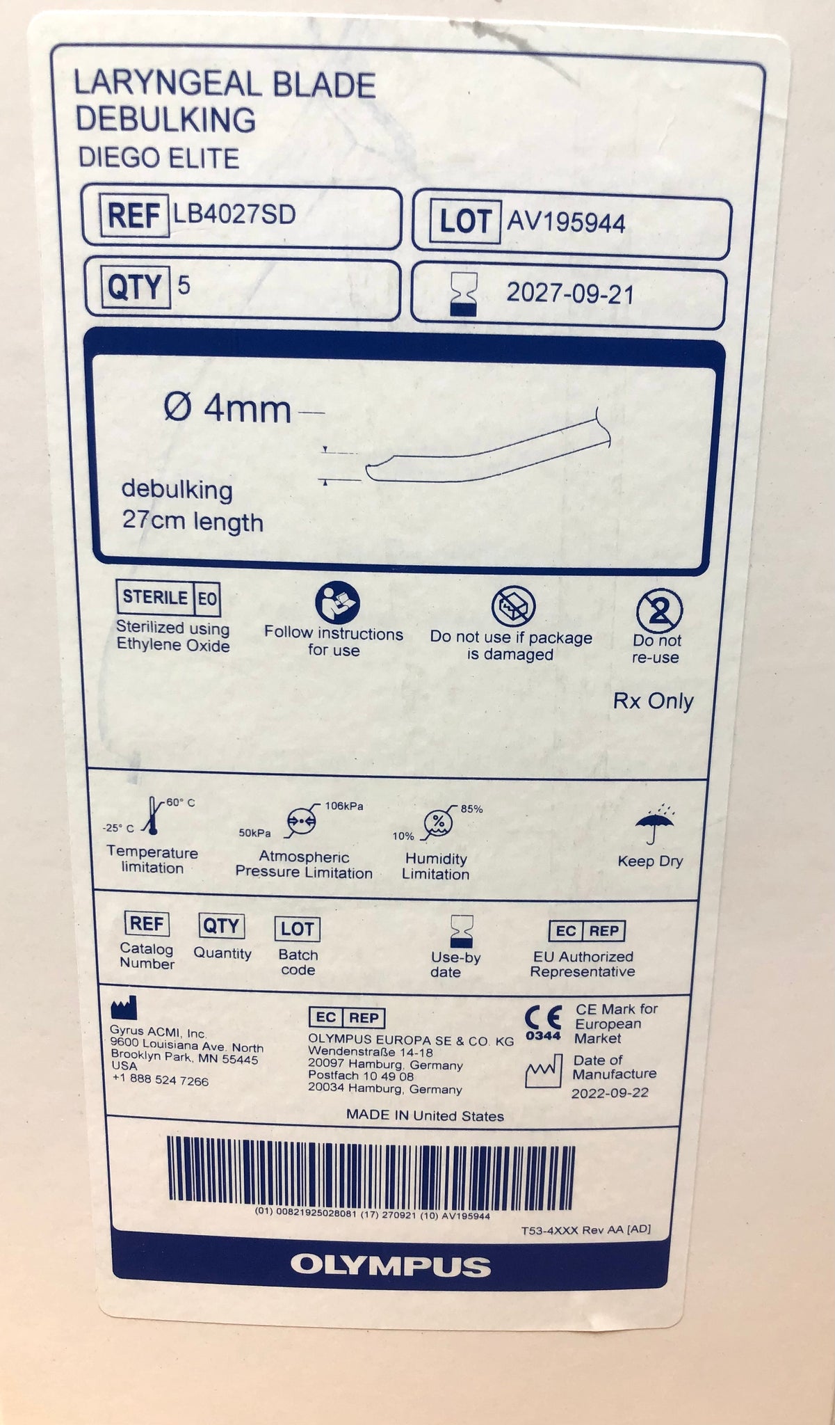 Listing is for a Box of 5 Olympus Diago Elite Debulking Laryngeal Blades.