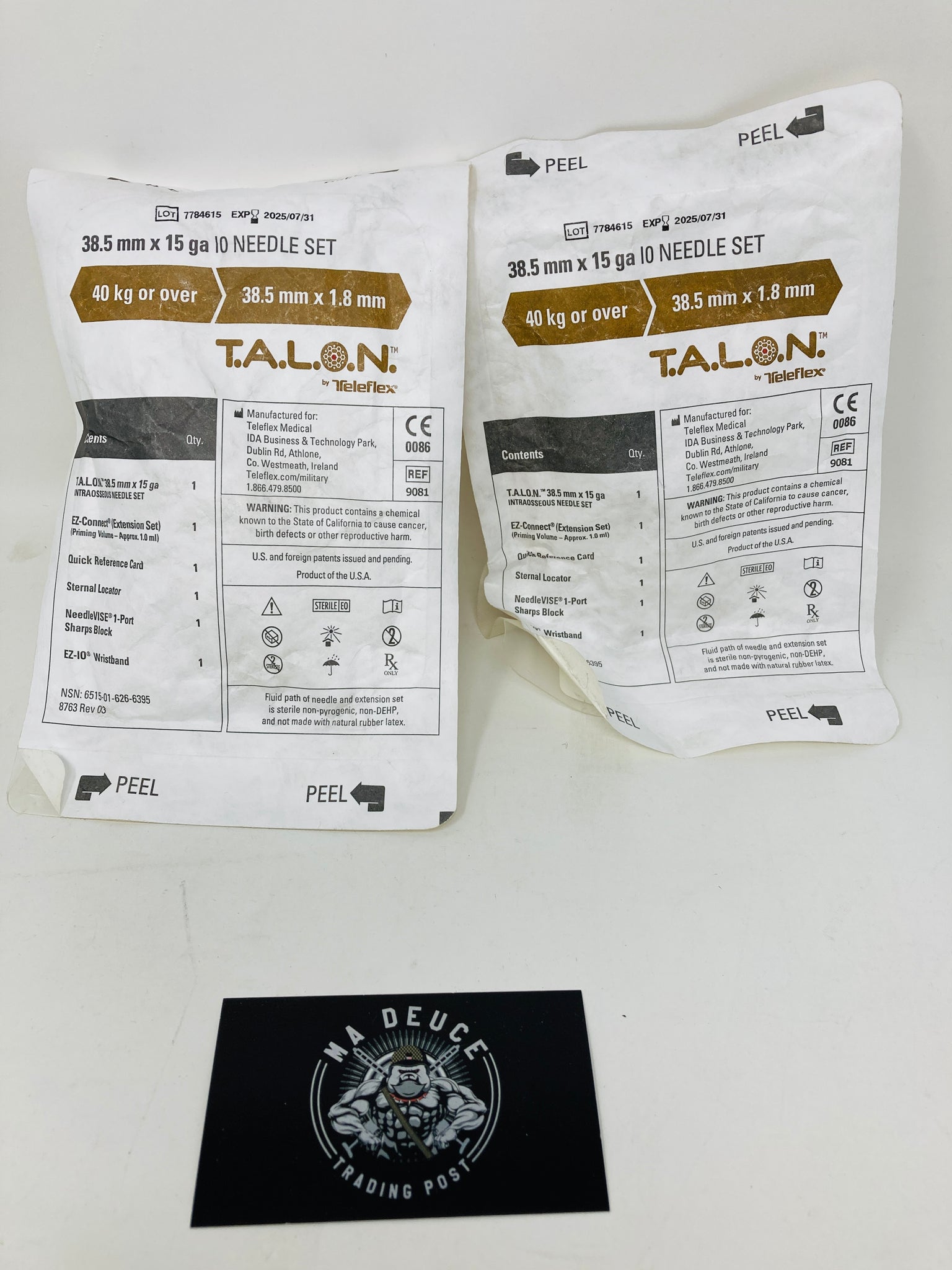 The EZ-IO™ T.A.L.O.N.™ Needle Set is the first and only manual IO device that enables 7-site IO access: the sternum, bilateral proximal humerus, bilateral proximal tibia, and bilateral distal tibia. Using IO access, battlefield responders can deliver fluids and medication rapidly and effectively to aide in resuscitation.