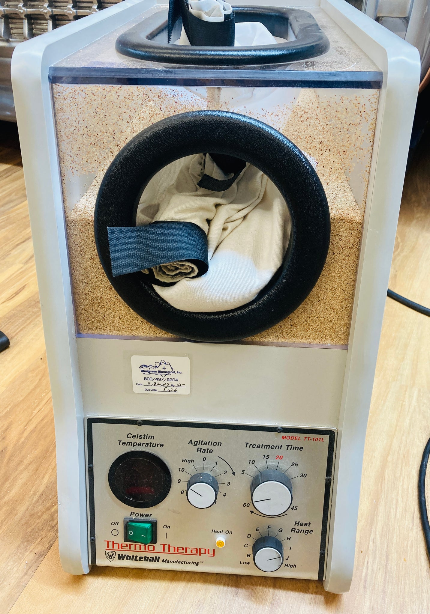 The Thermo-Therapy dry heat process offers the same benefits as hydrotherapy without the cleanup. Extremities are inserted into an environment akin to a dry whirlpool, where they are warmly massaged by granulated cellulose called Celstim, which emulates the very pleasant rolling and relaxing effects of water. Within the chamber, heated air swirls the Celstim around the arm or leg, which retains mobility. Extremities experience a stimulating effect that improves circulation. Thermo-Therapy has also been proven to assist greatly in the desensitization of various scars or other types of nerve pain. Additionally, the lower panels can be removed, the blowers quickly slide out for easy service. The unit has a patient protector above the air distributor plate, which eliminates static shock and moderates heat transfer. It is dual thermostat protected in both the treatment and heater chambers.